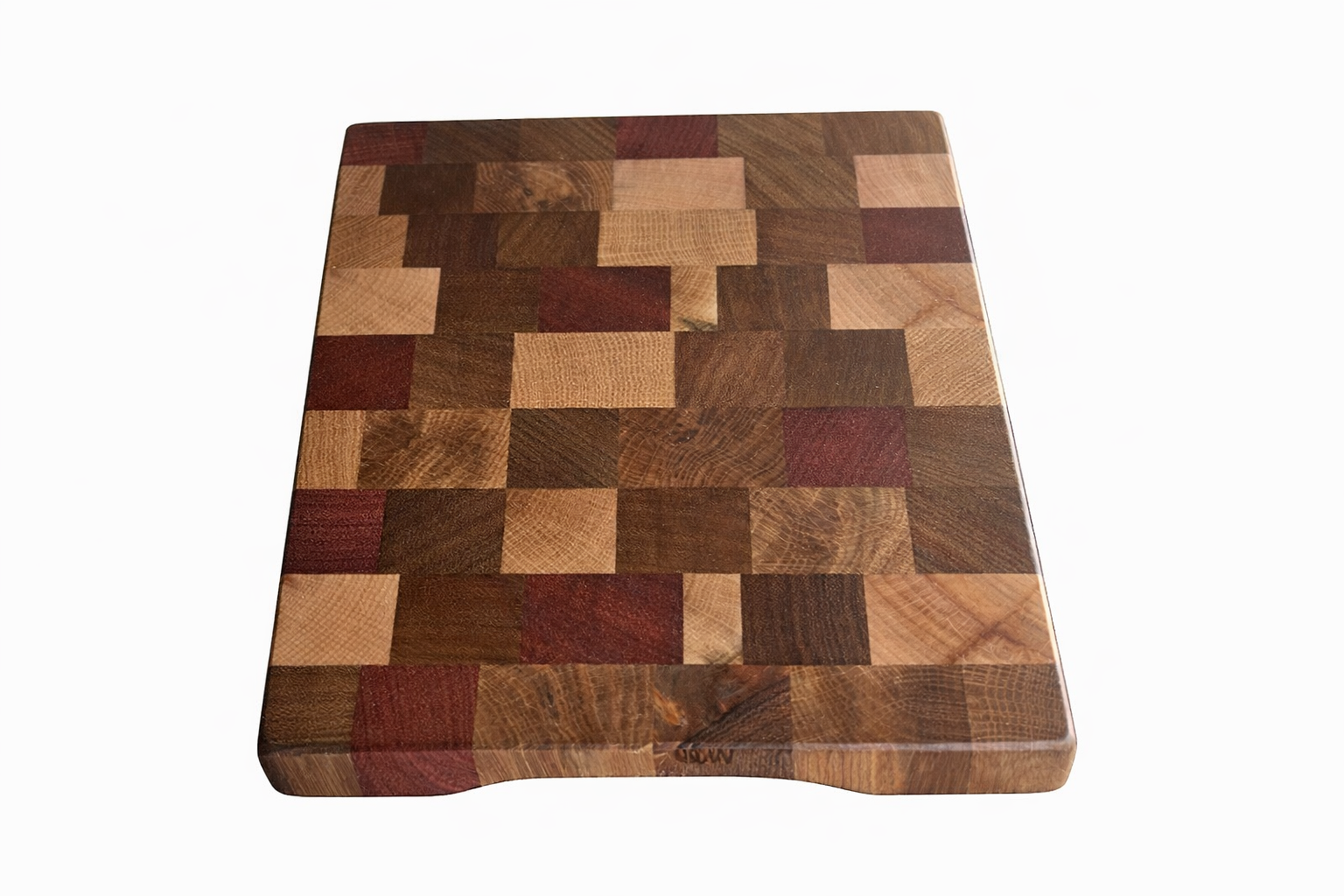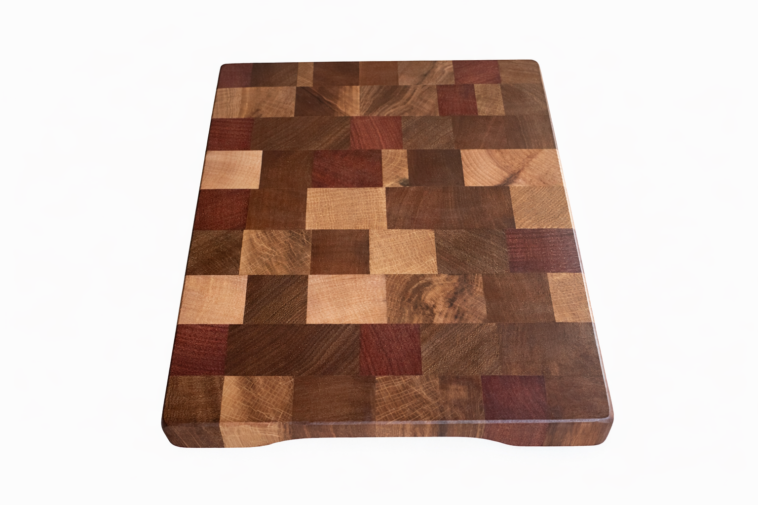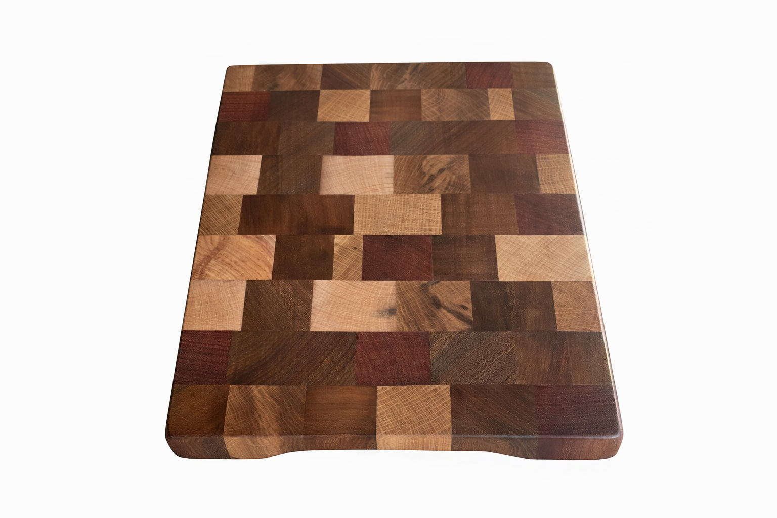 Esta tabla de cortar de madera de testa está hecha de maderas duras de haya, fresno, Iroko, nogal español y jatoba.