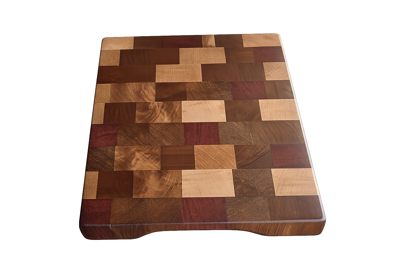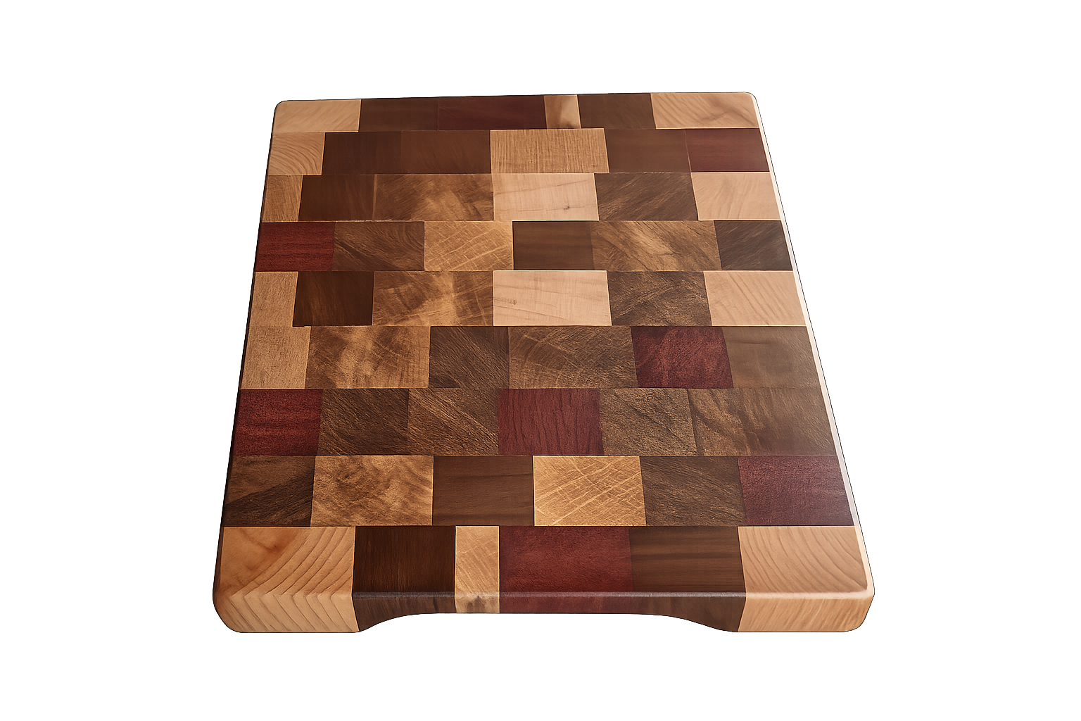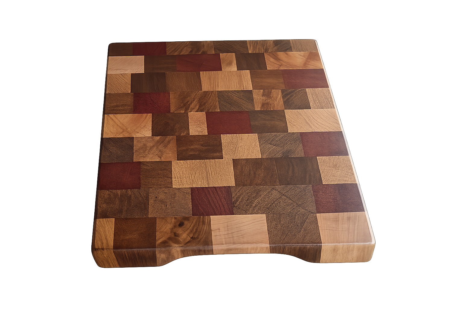 Esta tabla de cortar de madera de testa está hecha de maderas duras de haya, fresno, Iroko, nogal español y jatoba.